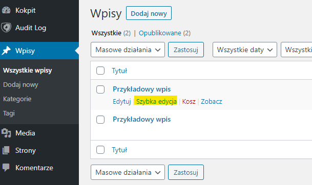 Przejdź do panelu WordPressa, wybierz zakładkę Wpisy lub Strony. Następnie na stronie z listą wpisów lub strony najedź na wybraną stronę i wybierz opcję Szybka edycja.