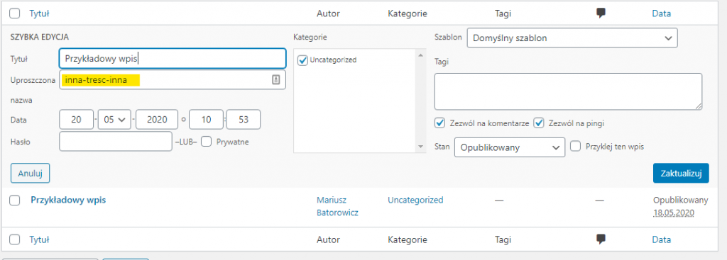 Po kliknięciu Szybka edycja, pojawi Ci się pole Uproszczona nazwa. W tym miejscu wpisz nazwę jaką chcesz mieć w swoim adresie wpisu lub strony. Kliknij przycisk Zaktualizuj i gotowe.