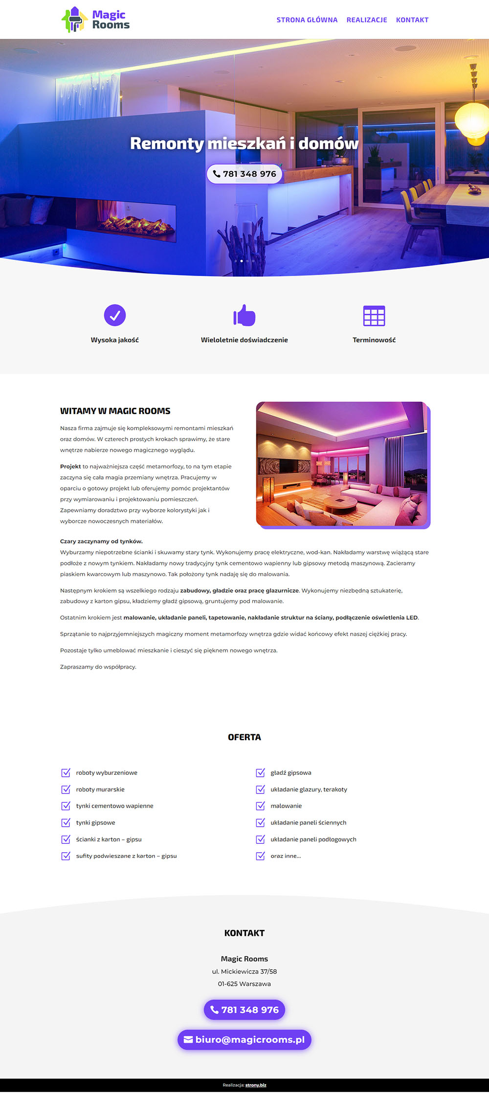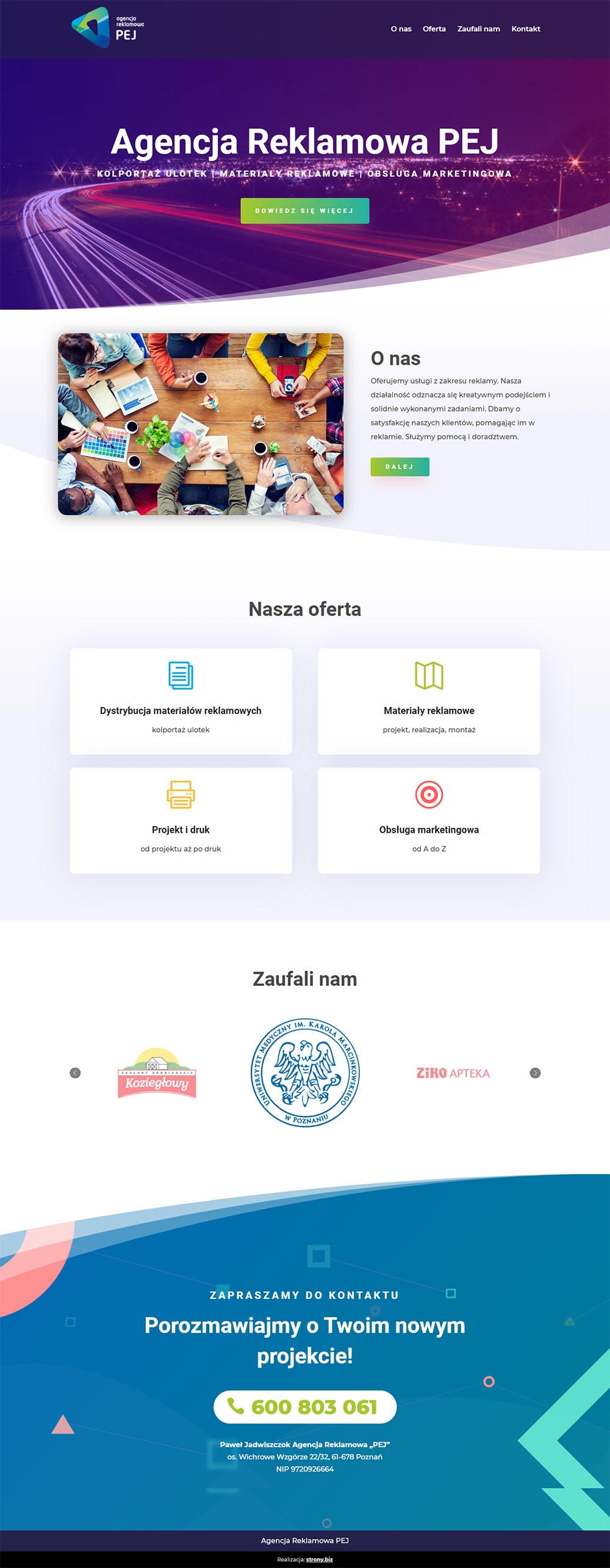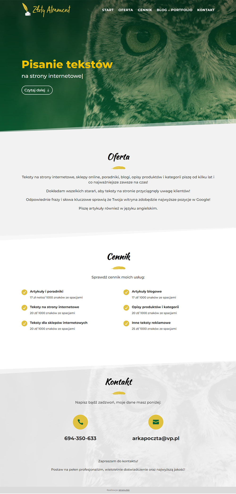 Tutaj opisz jakiej strony potrzebujesz. Jakie i ile treści przewidujesz na stronie (w późniejszym etapie poproszę Cię o dosłanie emailem treści na stronę). Czy to ma być prosta strona typu wizytówka, czy może coś bardziej rozbudowanego. Jakich funkcji na stronie potrzebujesz, np. formularz kontaktowy, mapka, itp. Czy interesuje Cię również płatna promocja w wyszukiwarce Google. Im więcej szczegółów podasz, tym lepiej.0 / 1000